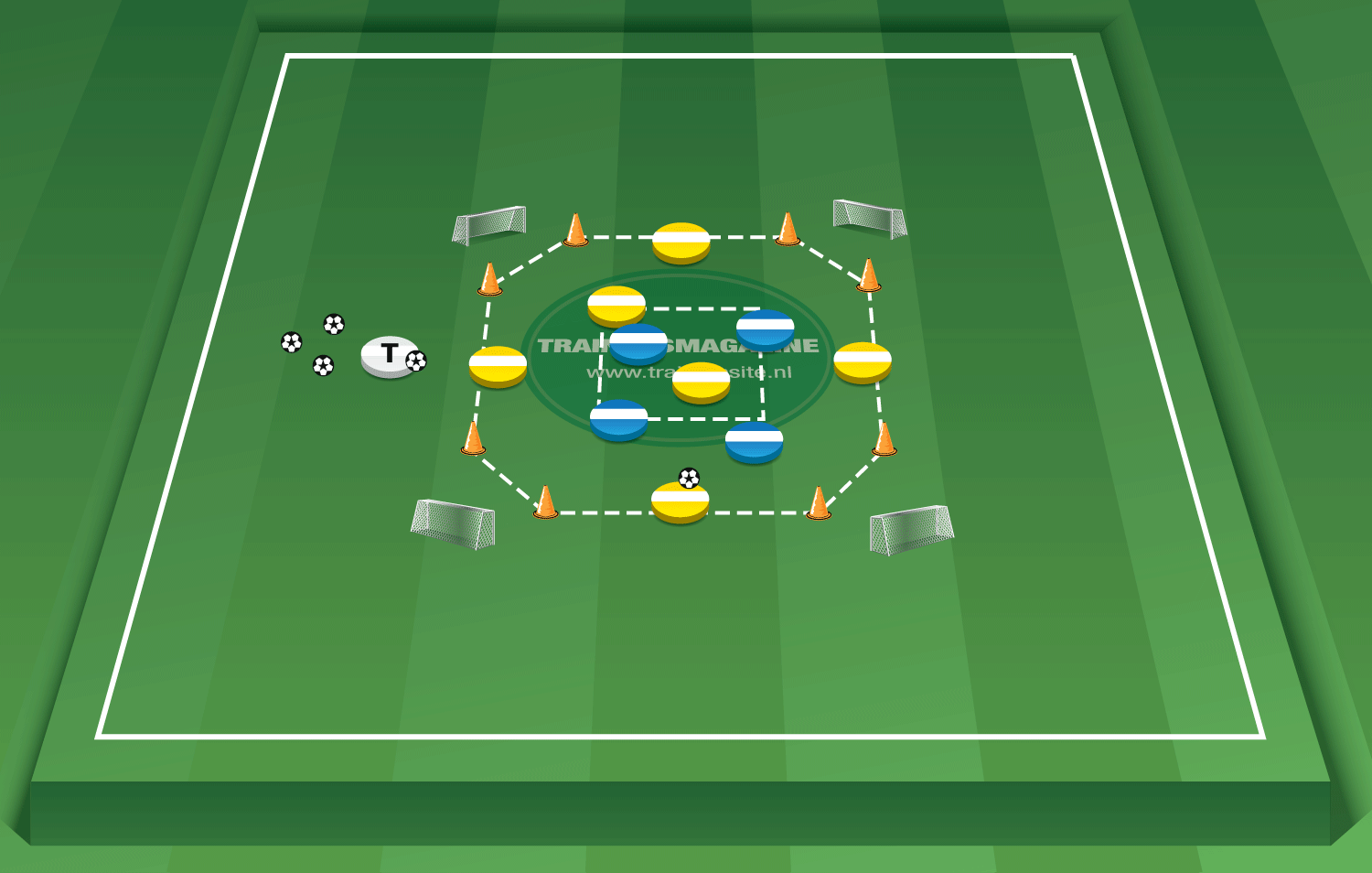 - Er wordt een positiespel gespeeld waarbij geel probeert op balbezit te spelen en blauw probeert de bal te veroveren en te scoren op een van de 4 doeltjes