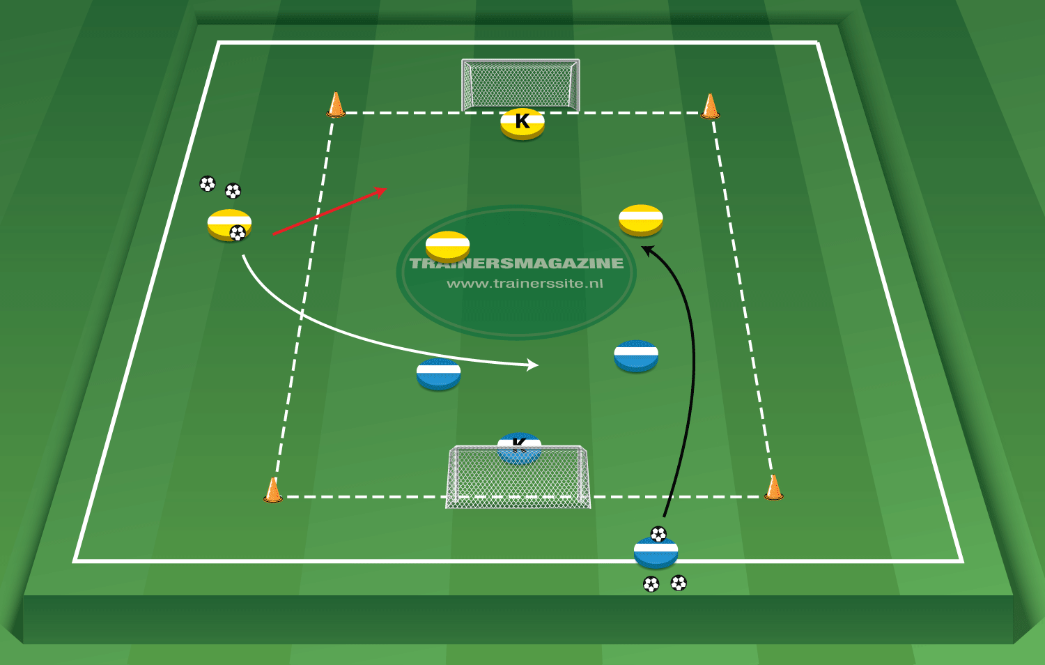 - Er wordt 2 tegen 2 op grote goals gestart, waarbij de bal steeds op een verschillende manier gestart wordt