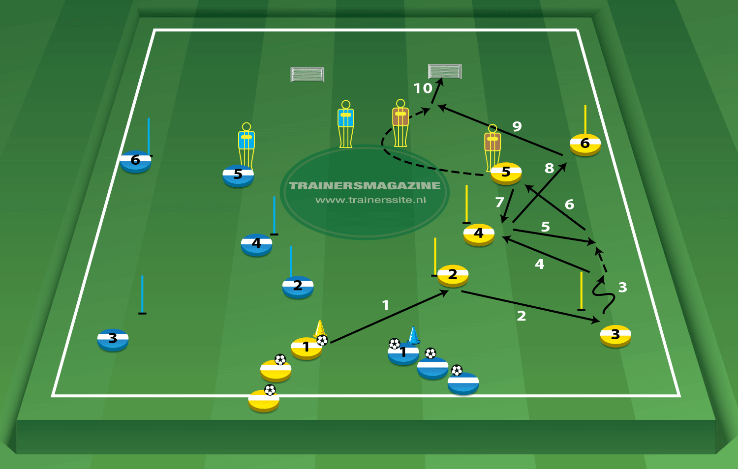 - Optioneel: in plaats van 2 kleine doeltjes 1 groot doel met keeper neerzetten en speler 6 een voorzet laten geven