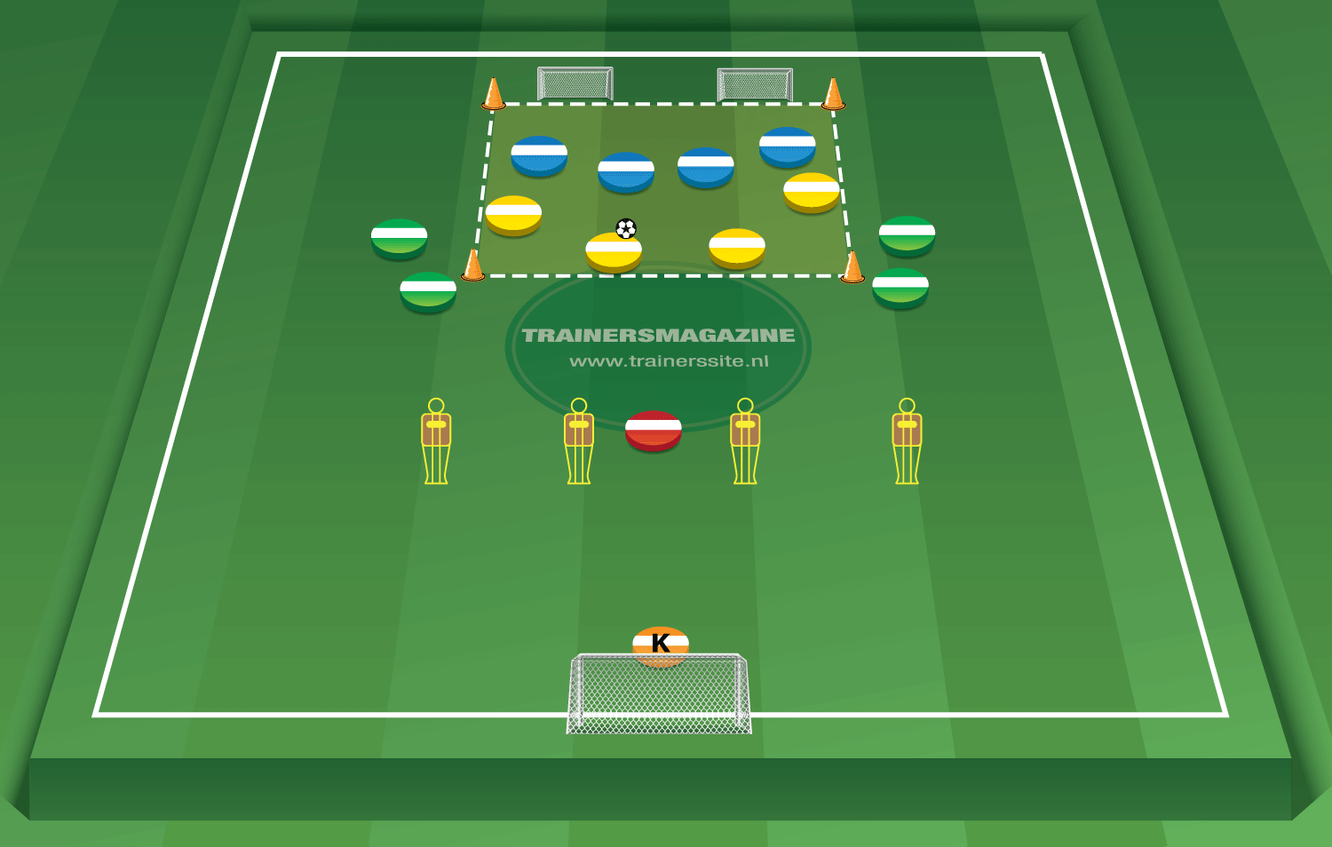 - Geel start in het speelveld met vorm 4 tegen 4, waarbij geel kan scoren op de kleine doeltjes