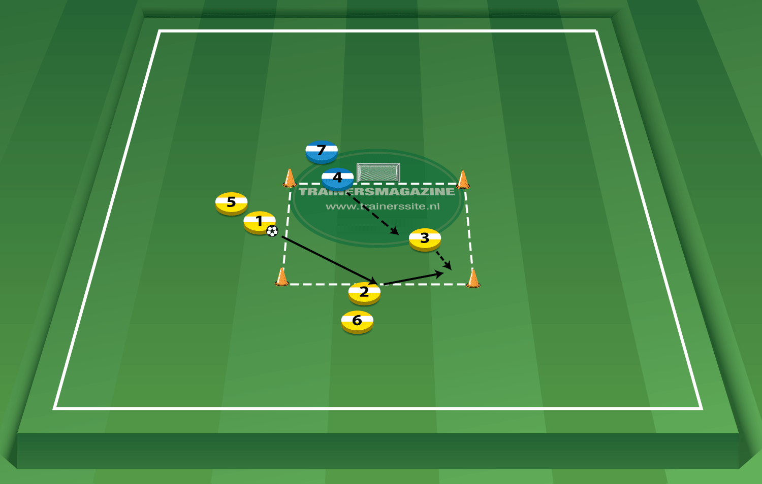 - Speler 1 speelt de bal naar speler 2 (die op de lijn staat) en speler 2 speelt de bal direct door naar speler 3 (maximaal 1x raken door speler 2)