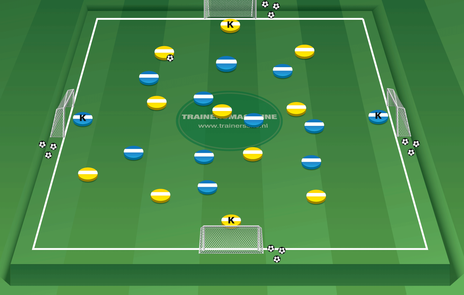 - 4 grote goals met keepers, op iedere zijde 1