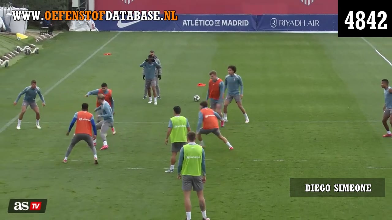 - Geel speelt op balbezit en mag na 6 passes de bal verplaatsen naar het andere vak. Blauw probeert dit te voorkomen, zowel in het grote vak (balverovering) als het middenvak (passlijnen afschermen)