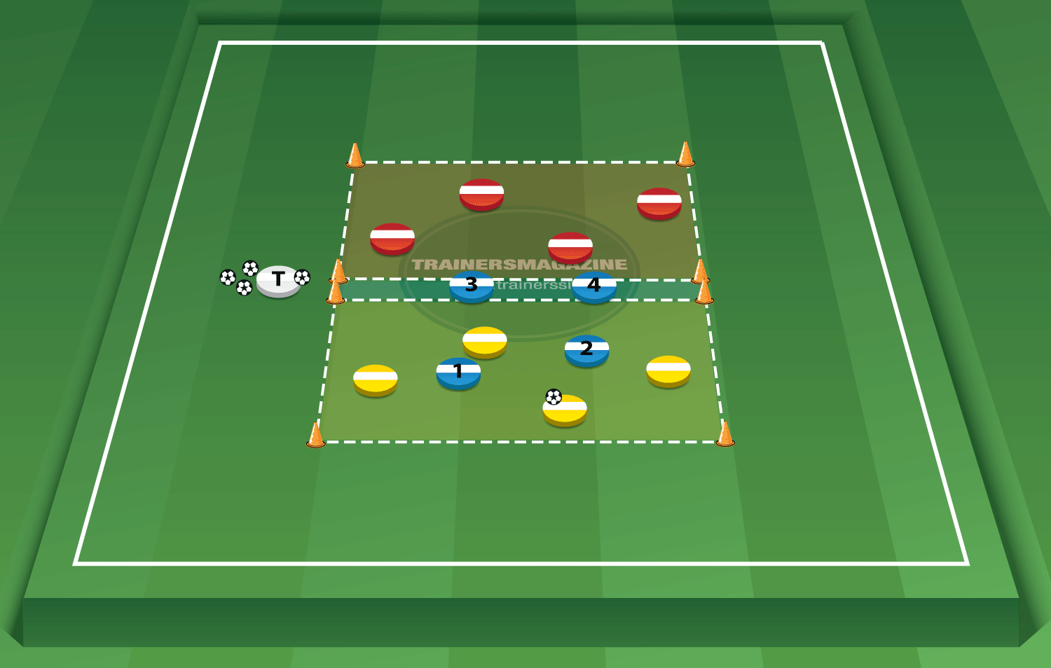 - Er wordt gestart in het onderste vak met een positiespel 4 (geel) tegen 2 (blauw). De overige 2 blauwe verdedigers staan in het middenvak. In het andere vak staat het andere team (rood)